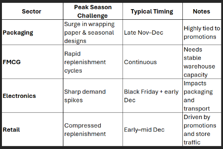 The table below highlights how holiday demand patterns differ by sector and when pressure typically peaks.