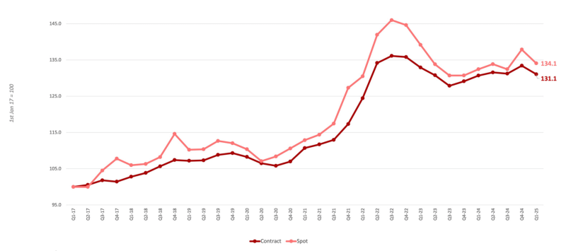 European road freight contract rates in Q1 2025 (Source: Upply).