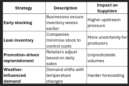 The table below summarises how different inventory behaviours during the holiday season influence suppliers across the value chain.