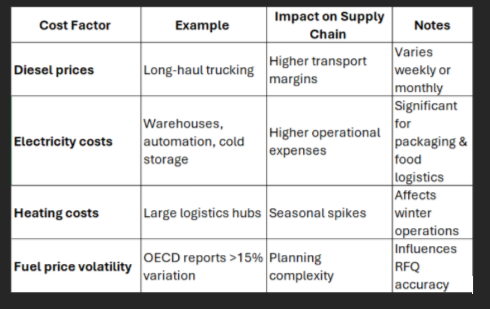 The table below outlines key cost drivers currently affecting European logistics and the implications they create for supply chain operations.