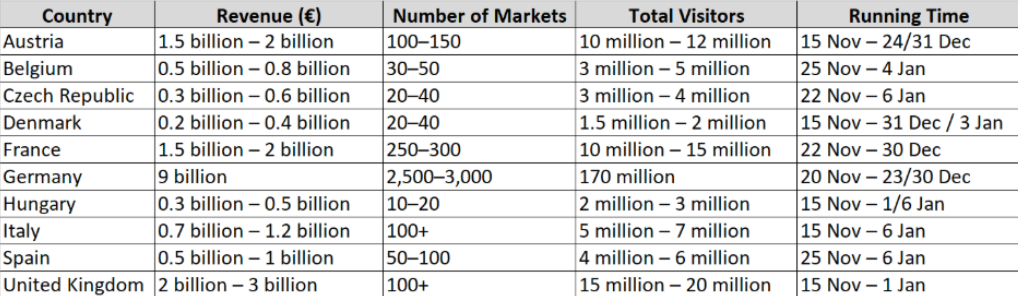This table shows how Christmas markets differ across Europe, helping international suppliers plan stock, deliveries and request for quotations for the peak season.
